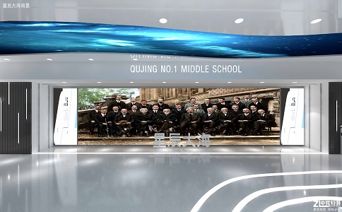 合影墻包含了曲靖一中 “紫薇花”?;盏暮x,藍 色燈帶如雙手托舉,象征著學(xué)校 和導(dǎo)師對學(xué)生的呵護體現(xiàn)出曲靖 一中潤澤育人的理念及祝賀學(xué)生 紫薇花盛開時節(jié)取得優(yōu)異成績的 美好愿景。