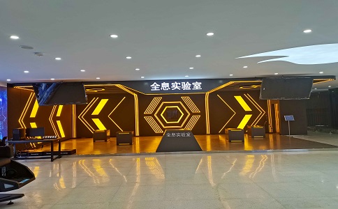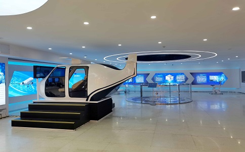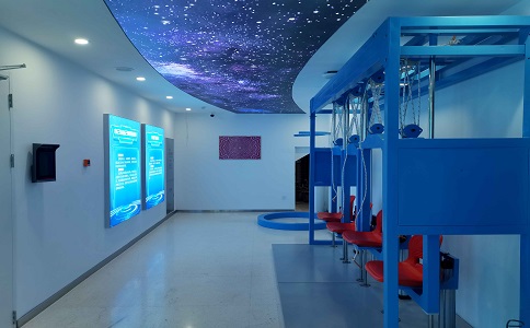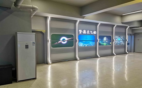 采用160°水平視角環(huán)幕, 24㎡超大觀影體驗,支持300萬 面超大規(guī)模虛擬現(xiàn)實場景實時 漫游,4160*1440 屏幕分辨率 高清數(shù)字媒體播放。墻上展現(xiàn) 了紫薇花飛船的編年史,增加 科技感。